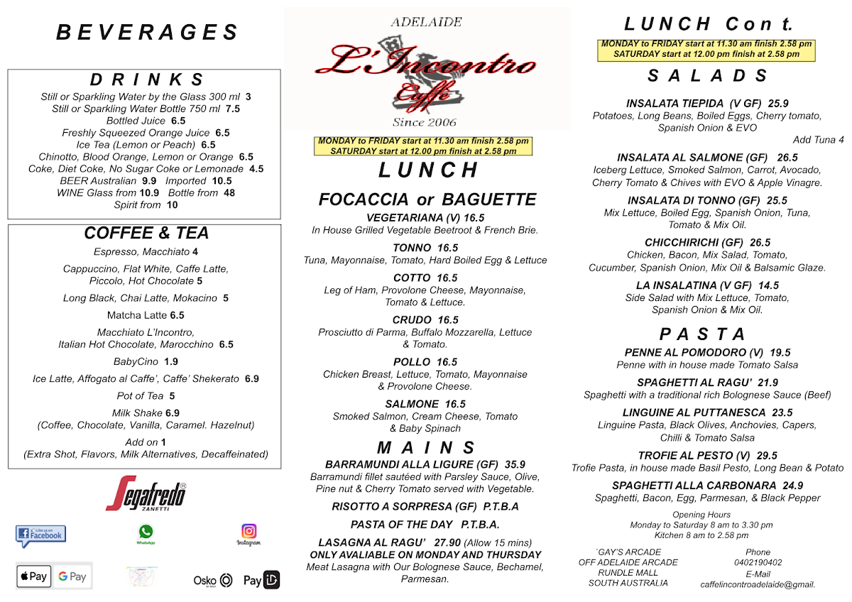 At Caffè L'incontro, the menu offers a refined yet approachable selection that caters to both casual diners and those seeking a more substantial meal. The lunch options highlight fresh sandwiches, with FOCACCIA or BAGUETTE VEGETARIANA (V), TONNO, COTTO, CRUDO, and POLLO, each thoughtfully prepared. Mains like the BARRAMUNDI ALLA LIGURE (GF) and RISOTTO A SORPRESA (GF) showcase seasonal ingredients, while comfort classics such as PASTA OF THE DAY and LASAGNA AL RAGU' provide familiar, hearty flavors. Salad choices are equally diverse, including INSALATA TIEPIDA (VGF), INSALATA AL SALMONE (GF), INSALATA DI TONNO (GF), CHICCHIRICHI (GF), and LA INSALATINA (VGF), emphasizing freshness and vibrant textures. Pasta lovers can enjoy traditional options like PENNE AL POMODORO (V), SPAGHETTI AL RAGU', LINGUINE AL PUTTANESCA, TROFIE AL PESTO (V), and SPAGHETTI ALLA CARBONARA, all prepared with care and classic Italian flavors. Complementing the dishes, the café serves beverages such as Still or Sparkling Water by the Glass 300 ml, Still or Sparkling Water Bottle 750 ml, Bottled Juice, Freshly Squeezed Orange Juice, and iced teas in lemon or peach, along with expertly brewed coffee and tea selections including Espresso, Macchiato, Cappuccino, Flat White, and Caffe Latte. Overall, the menu at Caffè L'incontro balances light, fresh options with indulgent Italian favorites, making it a versatile choice for any dining occasion.